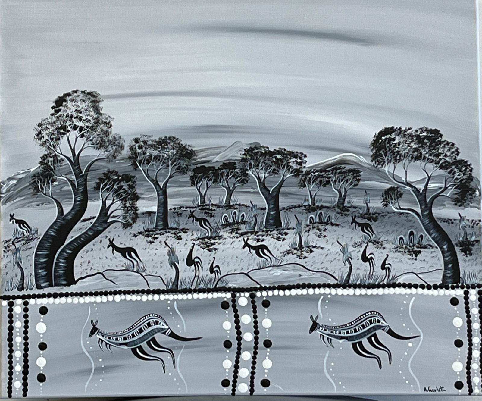 This captivating monochrome canvas captures the serene beauty of the Australian outback, portrayed through detailed trees, mountains, and roaming kangaroos. The grayscale palette adds a timeless, calming feel, while the lower panel highlights two stylized kangaroos decorated with traditional pattern work. This artwork blends modern minimalism with cultural storytelling, making it a striking centrepiece for any home, office, or gallery wall.