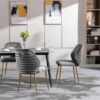 Introducing our exquisite Grey velvet dining chair with gold legs and a convenient pull-back handle. Elevate your dining experience with this luxurious and stylish seating option. Crafted with comfort and sophistication in mind, this chair is perfect for both formal dinners and everyday use. The lush black velvet upholstery not only feels sumptuous but also adds a touch of opulence to your dining space. The gold-finished legs provide stability and a touch of glamour, while the pull-back handle adds functionality and ease of use. Make a statement with this elegant dining chair – a harmonious blend of comfort, style, and convenience. Upgrade your dining area today!